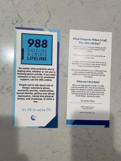 Our 988 Brochures have come in and they look great. We are so thankful to have them before the end the year. The first 1000 of them will be headed to Northview, Southview and TPS HS Libraries along with other local outlets that are in need of 988 literature.